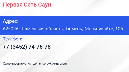Первая Сеть Саун по адресу 625026, Тюменская область, Тюмень, Мельникайте, 106 в дальнейшем Организация, размещена в следующих категориях: