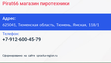 Pirat66, магазин пиротехники по адресу 625041, Тюменская область, Тюмень, Ямская, 118/1 в дальнейшем Организация, размещена в следующих категориях: