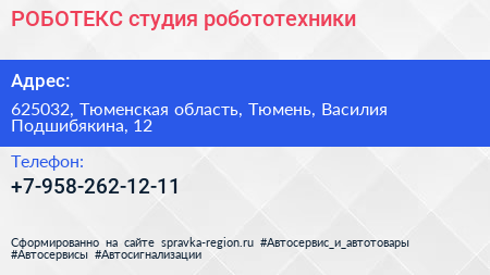 РОБОТЕКС, студия робототехники по адресу 625032, Тюменская область, Тюмень, Василия Подшибякина, 12 в дальнейшем Организация, размещена в следующих категориях: