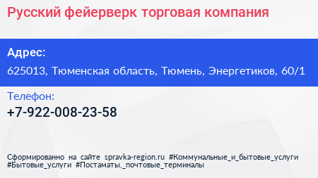 Русский фейерверк, торговая компания по адресу 625013, Тюменская область, Тюмень, Энергетиков, 60/1 в дальнейшем Организация, размещена в следующих категориях: