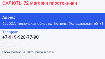 САЛЮТЫ.72, магазин пиротехники по адресу 625027, Тюменская область, Тюмень, Холодильная, 65 к1 в дальнейшем Организация, размещена в следующих категориях: