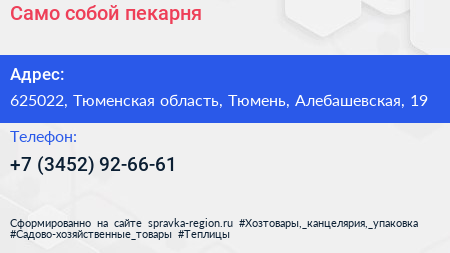 Само-собой, пекарня по адресу 625022, Тюменская область, Тюмень, Алебашевская, 19 в дальнейшем Организация, размещена в следующих категориях: