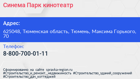 Синема Парк, кинотеатр по адресу 625048, Тюменская область, Тюмень, Максима Горького, 70 в дальнейшем Организация, размещена в следующих категориях: