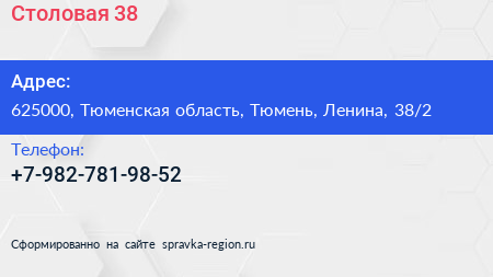 Столовая 38 по адресу 625000, Тюменская область, Тюмень, Ленина, 38/2 в дальнейшем Организация, размещена в следующих категориях: