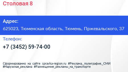Столовая №8 по адресу 625023, Тюменская область, Тюмень, Пржевальского, 37 в дальнейшем Организация, размещена в следующих категориях: