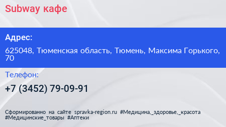 Subway, кафе по адресу 625048, Тюменская область, Тюмень, Максима Горького, 70 в дальнейшем Организация, размещена в следующих категориях: