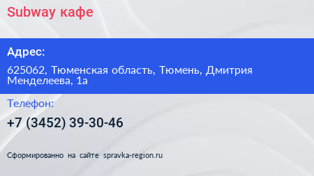 Subway, кафе по адресу 625062, Тюменская область, Тюмень, Дмитрия Менделеева, 1а в дальнейшем Организация, размещена в следующих категориях: