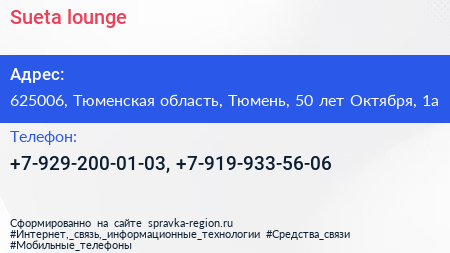Sueta lounge по адресу 625006, Тюменская область, Тюмень, 50 лет Октября, 1а в дальнейшем Организация, размещена в следующих категориях: