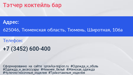 Тэтчер, коктейль-бар по адресу 625046, Тюменская область, Тюмень, Широтная, 106а в дальнейшем Организация, размещена в следующих категориях: