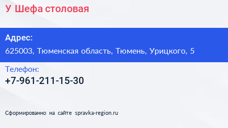 У Шефа, столовая по адресу 625003, Тюменская область, Тюмень, Урицкого, 5 в дальнейшем Организация, размещена в следующих категориях: