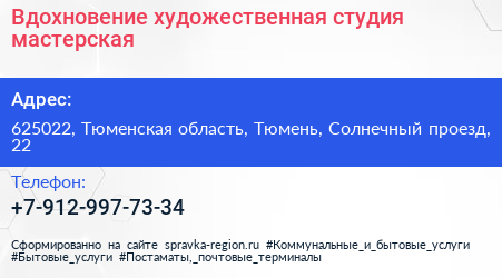 Вдохновение, художественная студия-мастерская по адресу 625022, Тюменская область, Тюмень, Солнечный проезд, 22 в дальнейшем Организация, размещена в следующих категориях: