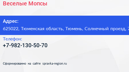 Веселые Мопсы по адресу 625022, Тюменская область, Тюмень, Солнечный проезд, 7 в дальнейшем Организация, размещена в следующих категориях: