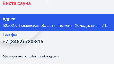 Вихта, сауна по адресу 625027, Тюменская область, Тюмень, Холодильная, 71а в дальнейшем Организация, размещена в следующих категориях: