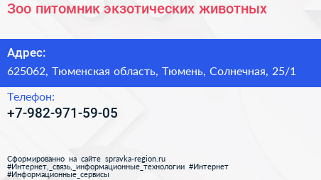 Зоо-питомник экзотических животных по адресу 625062, Тюменская область, Тюмень, Солнечная, 25/1 в дальнейшем Организация, размещена в следующих категориях: