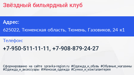 Звёздный, бильярдный клуб по адресу 625022, Тюменская область, Тюмень, Газовиков, 24 к1 в дальнейшем Организация, размещена в следующих категориях: