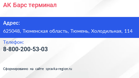 АК Барс, терминал по адресу 625048, Тюменская область, Тюмень, Холодильная, 114 в дальнейшем Организация, размещена в следующих категориях: