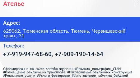 Ателье по адресу 625062, Тюменская область, Тюмень, Червишевский тракт, 31 в дальнейшем Организация, размещена в следующих категориях: