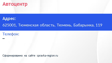 Автоцентр по адресу 625001, Тюменская область, Тюмень, Бабарынка, 119 в дальнейшем Организация, размещена в следующих категориях: