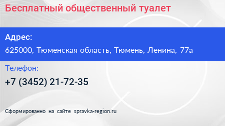 Бесплатный общественный туалет по адресу 625000, Тюменская область, Тюмень, Ленина, 77а в дальнейшем Организация, размещена в следующих категориях: