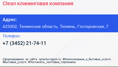 Clean, клининговая компания по адресу 625002, Тюменская область, Тюмень, Госпаровская, 7 в дальнейшем Организация, размещена в следующих категориях: