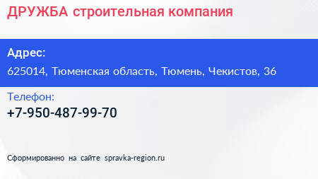 ДРУЖБА, строительная компания по адресу 625014, Тюменская область, Тюмень, Чекистов, 36 в дальнейшем Организация, размещена в следующих категориях: