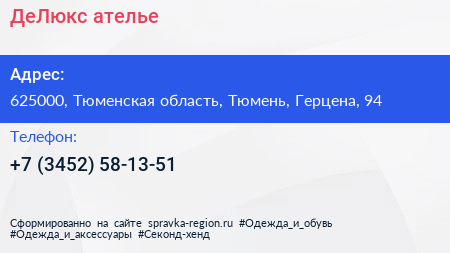 ДеЛюкс, ателье по адресу 625000, Тюменская область, Тюмень, Герцена, 94 в дальнейшем Организация, размещена в следующих категориях: