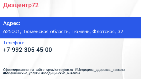 Дезцентр72 по адресу 625001, Тюменская область, Тюмень, Флотская, 32 в дальнейшем Организация, размещена в следующих категориях: