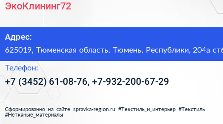 ЭкоКлининг72 по адресу 625019, Тюменская область, Тюмень, Республики, 204а ст6 в дальнейшем Организация, размещена в следующих категориях: