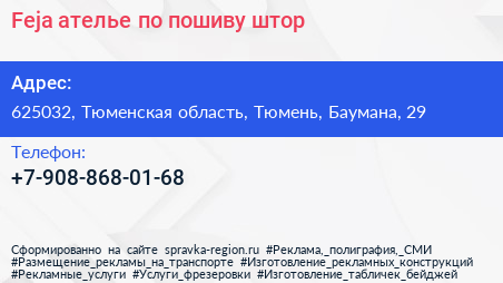 Feja, ателье по пошиву штор по адресу 625032, Тюменская область, Тюмень, Баумана, 29 в дальнейшем Организация, размещена в следующих категориях: