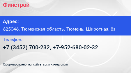 Финстрой по адресу 625046, Тюменская область, Тюмень, Широтная, 8а в дальнейшем Организация, размещена в следующих категориях: