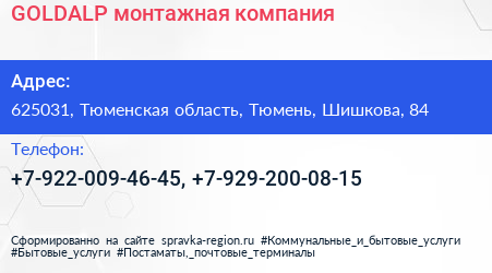 GOLDALP, монтажная компания по адресу 625031, Тюменская область, Тюмень, Шишкова, 84 в дальнейшем Организация, размещена в следующих категориях: