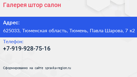 Галерея штор, салон по адресу 625033, Тюменская область, Тюмень, Павла Шарова, 7 к2 в дальнейшем Организация, размещена в следующих категориях: