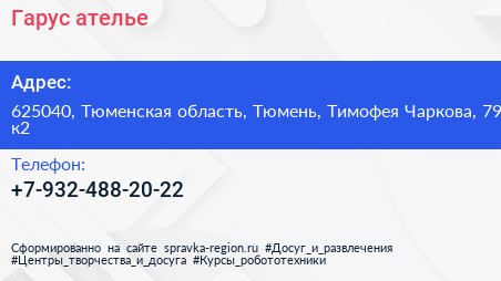 Гарус, ателье по адресу 625040, Тюменская область, Тюмень, Тимофея Чаркова, 79 к2 в дальнейшем Организация, размещена в следующих категориях: