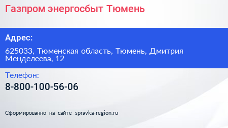 Газпром энергосбыт Тюмень по адресу 625033, Тюменская область, Тюмень, Дмитрия Менделеева, 12 в дальнейшем Организация, размещена в следующих категориях: