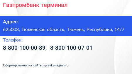 Газпромбанк, терминал по адресу 625003, Тюменская область, Тюмень, Республики, 14/7 в дальнейшем Организация, размещена в следующих категориях: