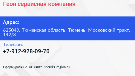 Геон, сервисная компания по адресу 625049, Тюменская область, Тюмень, Московский тракт, 142/3 в дальнейшем Организация, размещена в следующих категориях: