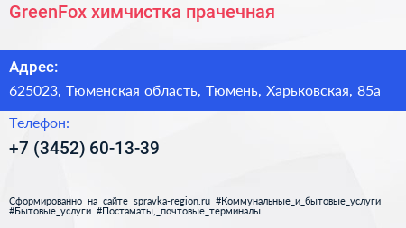 GreenFox, химчистка-прачечная по адресу 625023, Тюменская область, Тюмень, Харьковская, 85а в дальнейшем Организация, размещена в следующих категориях: