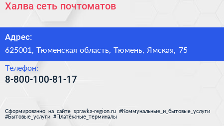 Халва, сеть почтоматов по адресу 625001, Тюменская область, Тюмень, Ямская, 75 в дальнейшем Организация, размещена в следующих категориях: