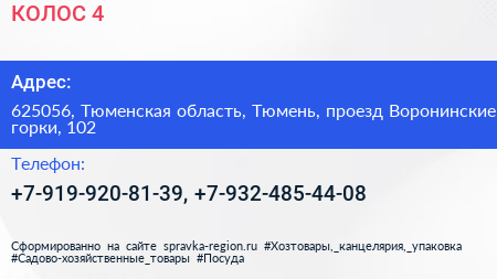КОЛОС-4 по адресу 625056, Тюменская область, Тюмень, проезд Воронинские горки, 102 в дальнейшем Организация, размещена в следующих категориях: