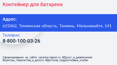 Контейнер для батареек по адресу 625062, Тюменская область, Тюмень, Мельникайте, 141 в дальнейшем Организация, размещена в следующих категориях:
