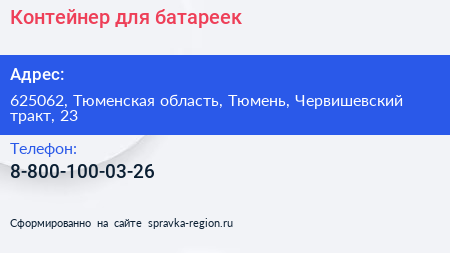 Контейнер для батареек по адресу 625062, Тюменская область, Тюмень, Червишевский тракт, 23 в дальнейшем Организация, размещена в следующих категориях: