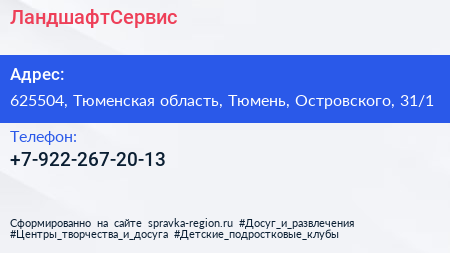 ЛандшафтСервис по адресу 625504, Тюменская область, Тюмень, Островского, 31/1 в дальнейшем Организация, размещена в следующих категориях: