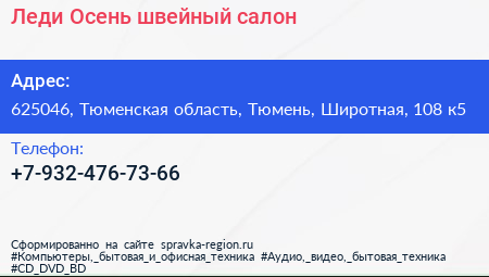 Леди Осень, швейный салон по адресу 625046, Тюменская область, Тюмень, Широтная, 108 к5 в дальнейшем Организация, размещена в следующих категориях: