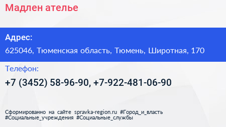 Мадлен, ателье по адресу 625046, Тюменская область, Тюмень, Широтная, 170 в дальнейшем Организация, размещена в следующих категориях:
