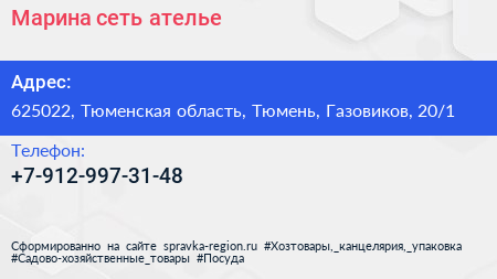 Марина, сеть ателье по адресу 625022, Тюменская область, Тюмень, Газовиков, 20/1 в дальнейшем Организация, размещена в следующих категориях:
