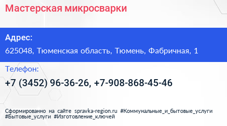 Мастерская микросварки по адресу 625048, Тюменская область, Тюмень, Фабричная, 1 в дальнейшем Организация, размещена в следующих категориях: