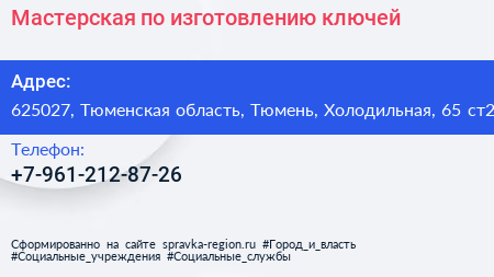 Мастерская по изготовлению ключей по адресу 625027, Тюменская область, Тюмень, Холодильная, 65 ст2 в дальнейшем Организация, размещена в следующих категориях: