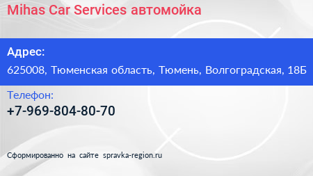 Mihas Car Services, автомойка по адресу 625008, Тюменская область, Тюмень, Волгоградская, 18Б в дальнейшем Организация, размещена в следующих категориях: