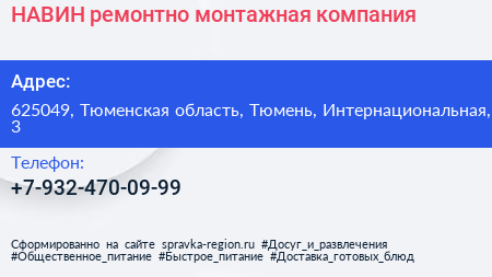 НАВИН, ремонтно-монтажная компания по адресу 625049, Тюменская область, Тюмень, Интернациональная, 3 в дальнейшем Организация, размещена в следующих категориях: