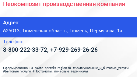 Неокомпозит, производственная компания по адресу 625013, Тюменская область, Тюмень, Пермякова, 1а в дальнейшем Организация, размещена в следующих категориях: